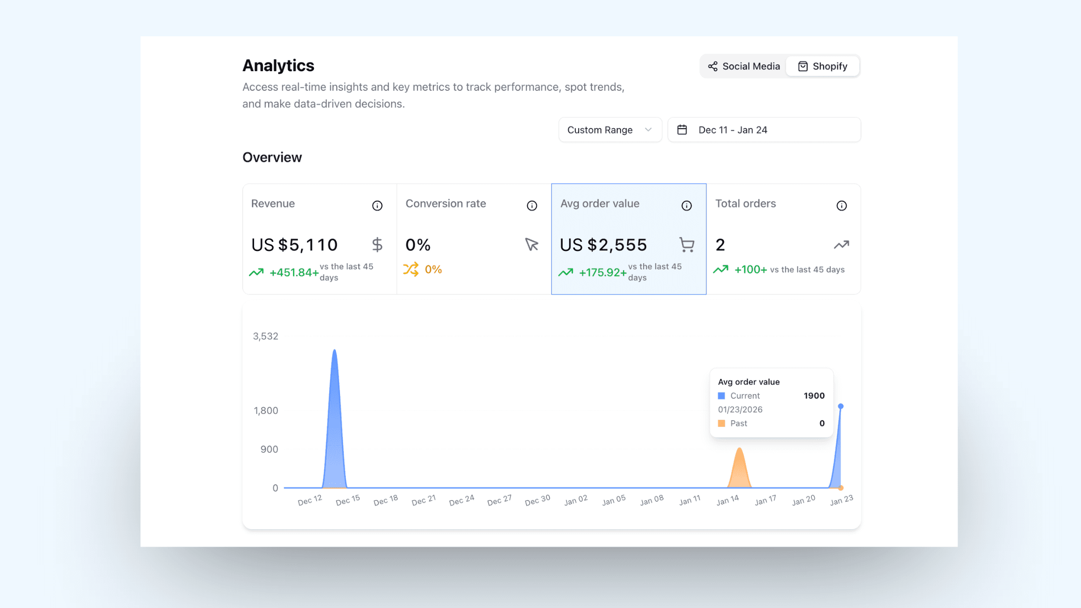 Just head to the Analytics tab and click “Shopify” in the top-right corner to instantly view your store’s data, all in one place.